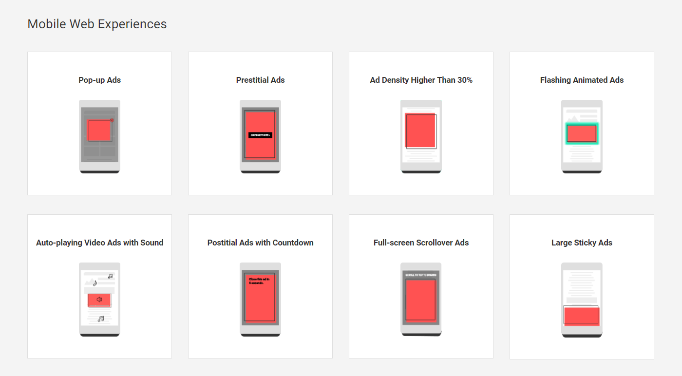 So here, Google wants to end those disguised links that pose like a play button or uses transparent overlays, full-page interstitials ads that appear before a page loads, flashing animated ads, and videos that autoplay with sound.