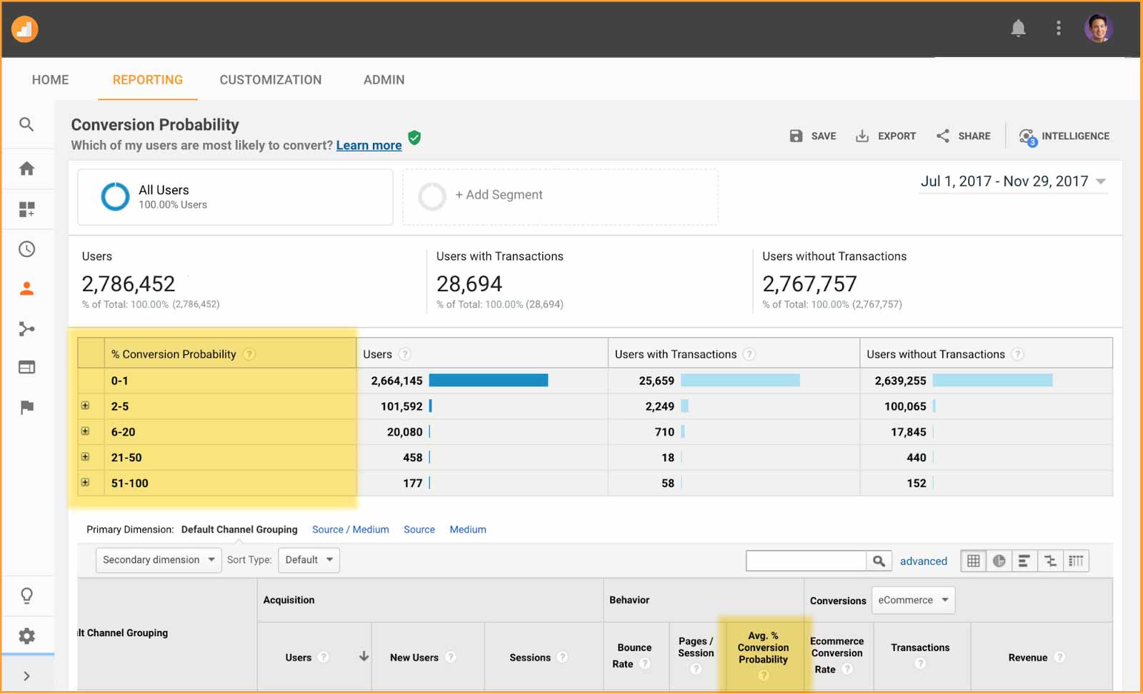 Analytics also adds Conversion Probability report which shows the Conversion Probability for all users, including across important dimensions such as channel.