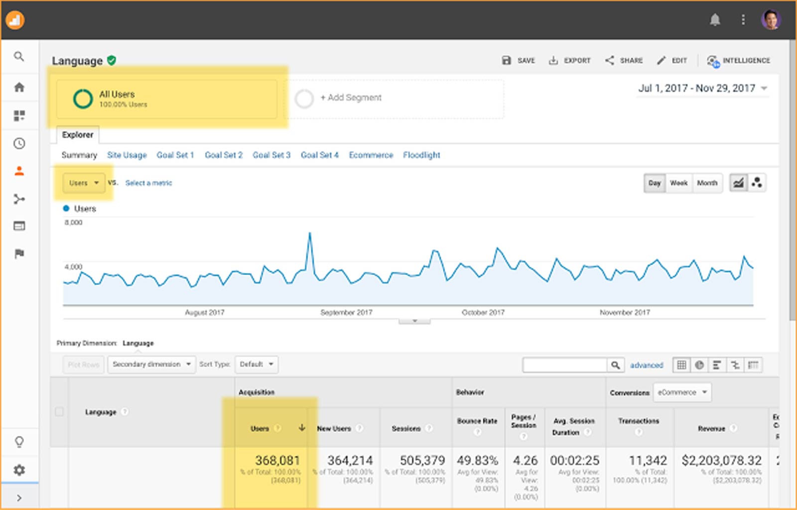 User data can also be further analyzed in other reports such as Active Users, Cohort Analysis and Lifetime Value.
