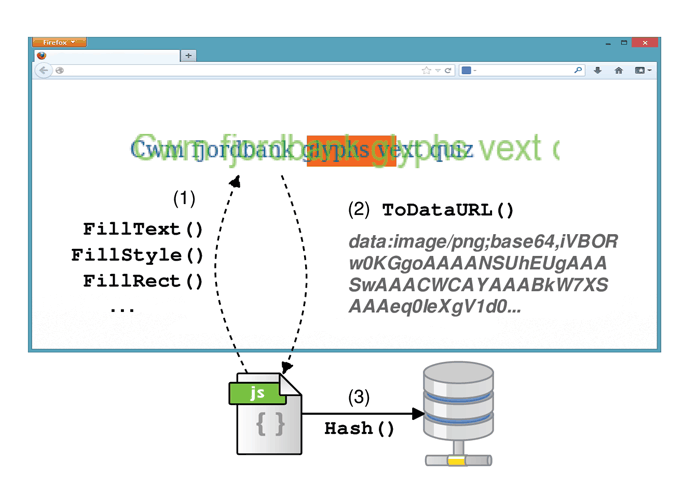 To fingerprint users, a website users are visiting, sends code to the browser that draws an invisible element on the page they are viewing. Then the users' hardware makes variations in that element that make it fairly unique. The result is then hashed (converted into a string of characters) and stored.